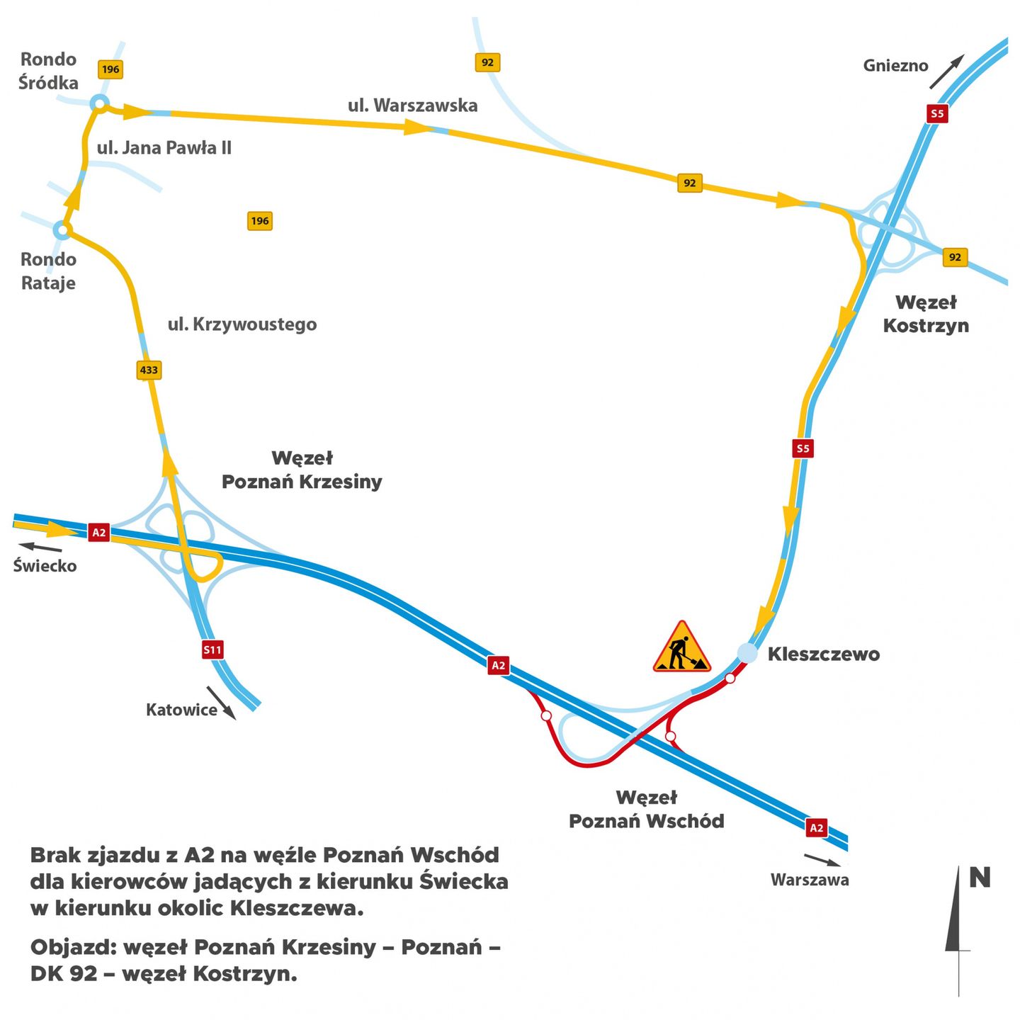 - podróżujący z kierunku Świecka skierowani zostaną na węzeł Poznań Krzesiny, a następnie przez Poznań i DK92 do Kostrzyna i dalej w kierunku S5.