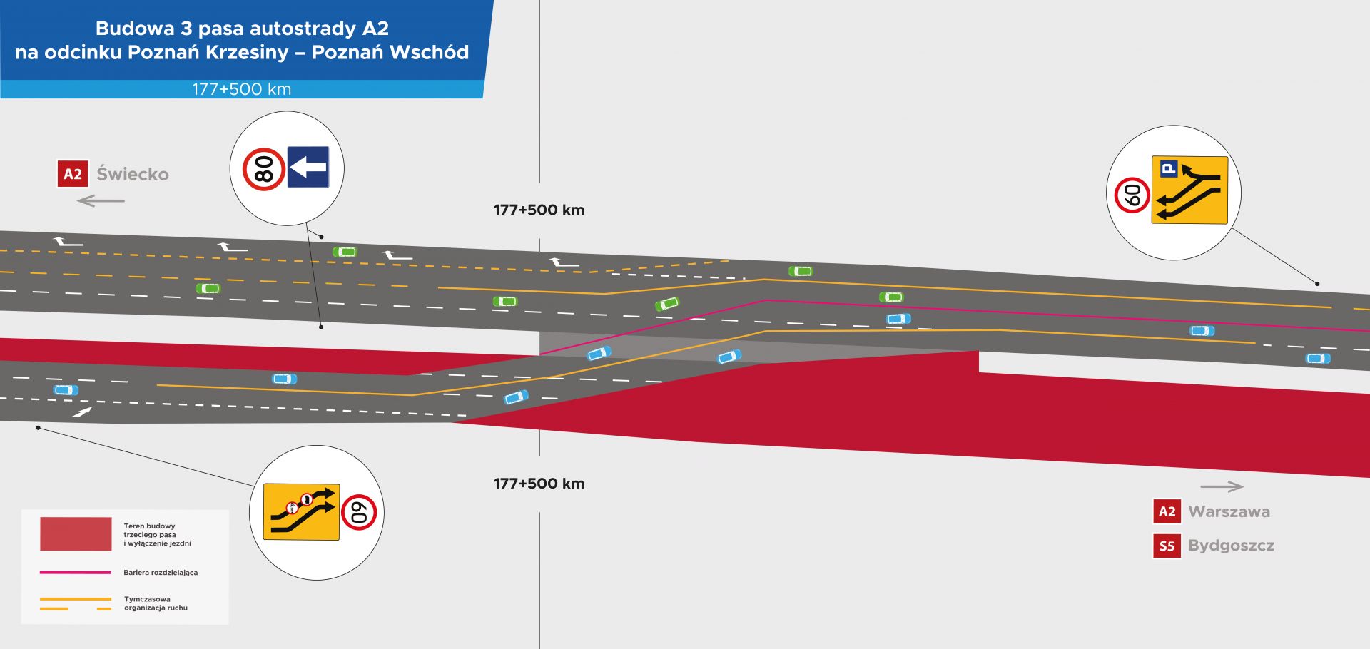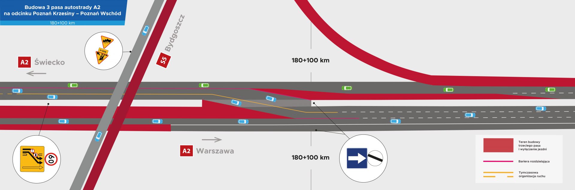 Dodatkowo, w rejonie samego węzła (między 177. a 180. km autostrady) ruch zostanie przełożony na północną jezdnię A2. Dla każdego kierunku wyznaczone będą po dwa pasy ruchu, ale obowiązywać będzie ograniczenie prędkości do 60 km/h. Pas awaryjny nie będzie dostępny, a na lewych pasach w obu kierunkach obowiązywać będzie zakaz jazdy dla ciężarówek.