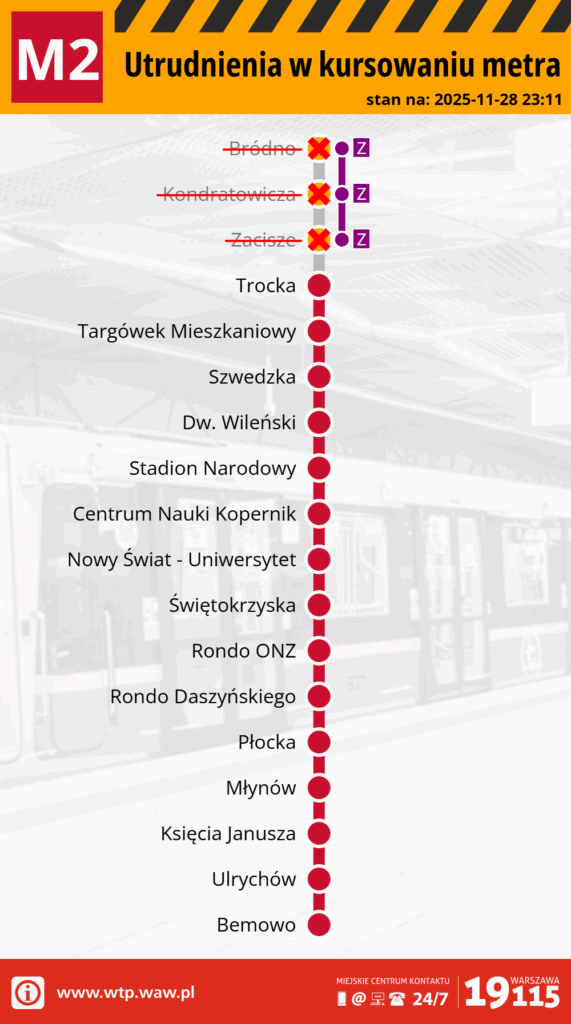 Z przyczyny technicznej pociągi metra linii M2 nie kursują na odcinku Bródno <> Zacisze.