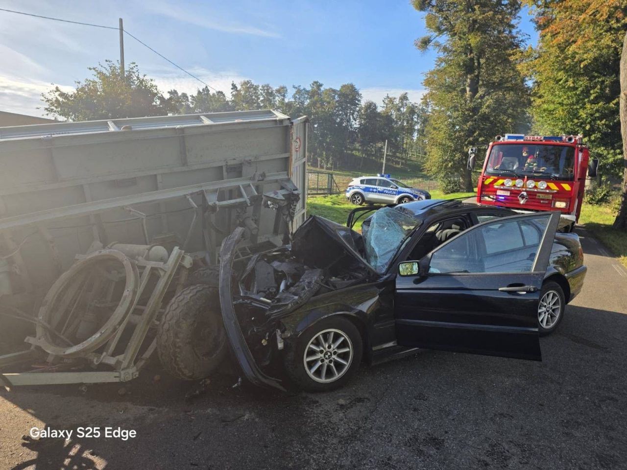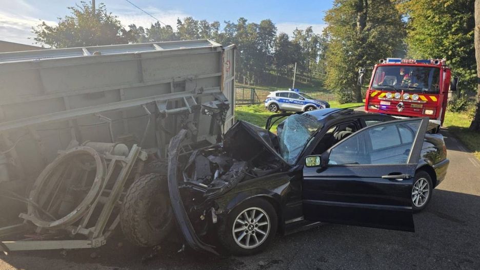 Woj. pomorskie: Samochód osobowy uderzył w tył przyczepy rolniczej. Policja: "Jesienne poranki potrafią być zdradliwe"