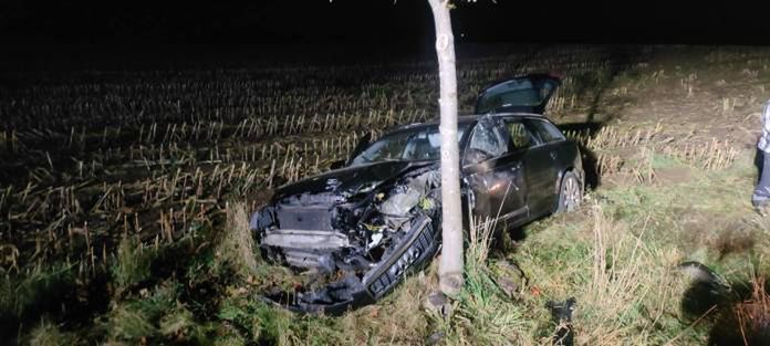 Rozbite Audi wypadło z drogi i zatrzymało się w rowie. Ciągnik Zetor z przyczepą, który według wstępnych ustaleń miał wymusić pierwszeństwo, pozostał na asfalcie – z rozrzuconymi częściami wokół.