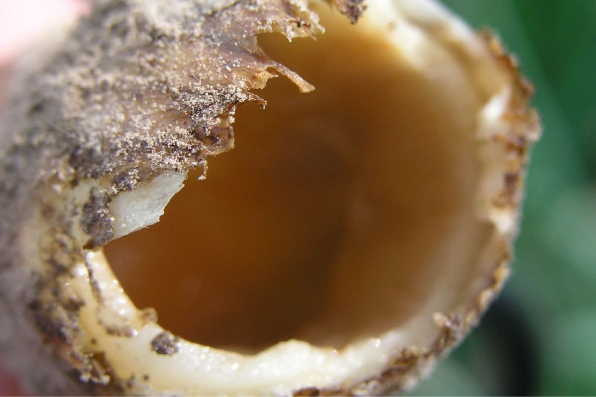 Najczęściej spotykanym problemem w ostatnich sezonach jest fuzaryjna zgnilizna cebuli (Fusarium oxysporum f. sp. cepae). Choroba rozwija się od piętki cebuli, gdzie grzyb przenika do tkanek, powodując gnicie miąższu. Z czasem cebula mięknie, traci zapach i zaczyna wydzielać charakterystyczny, stęchły aromat. W przekroju widoczne są białe lub różowawe przebarwienia, które w miarę rozwoju ciemnieją. Absolutnie taka cebula nie nadaje się do spożycia, nawet po usunięciu chorych warstw. Grzyby z rodzaju Fusarium wytwarzają bowiem toksyny bardzo groźne dla ludzi. Te metabolity przenikają nawet do zdrowych łusek cebuli.