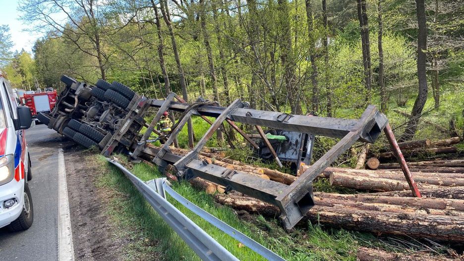 Kierowca ciężarowego MAN-a, przewożącego drewno, zjechał do przydrożnego rowu, co doprowadziło do wywrócenia pojazdu. Na szczęście nikt nie odniósł obrażeń.