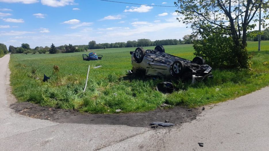 W wyniku zderzenia pojazdów osoby podróżujące renault z obrażeniami ciała zostały przetransportowane do szpitala na badania. Samochód marki Volvo dachował. Na szczęście kierująca nim kobieta nie odniosła obrażeń.